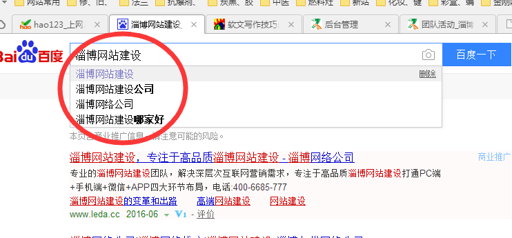 我們以淄博網(wǎng)站建設為例,來(lái)看看,百度下拉框出現什么長(cháng)尾關(guān)鍵詞。